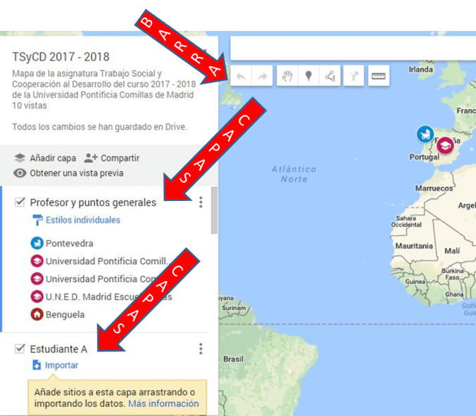 Al principio, las “capas” aparecerán sin personalizar, “Estudiante A”, “Estudiante B” y así sucesivamente. En la medida en la que vayas participando en la creación del mapa, la capa será personalizada y mostrará tu nombre y apellidos y todos los puntos que geolocalices deberán aparecer en esa sección que es tuya.