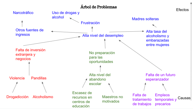 Por otro lado, tal y como se describe en el Diagnóstico, creo que la falta de oportunidades de empleo es debido a la huida de la inversión exterior y al cierre de los pequeños comercios, generado, entre otras causas, por la violencia existente en el barrio. Por lo que, desde mi punto de vista, “alta tasa de desempleo” y “falta de oportunidades de empleo” son consecuencias de la “violencia de pandillas” tal y como está descrito en el Diagnóstico.