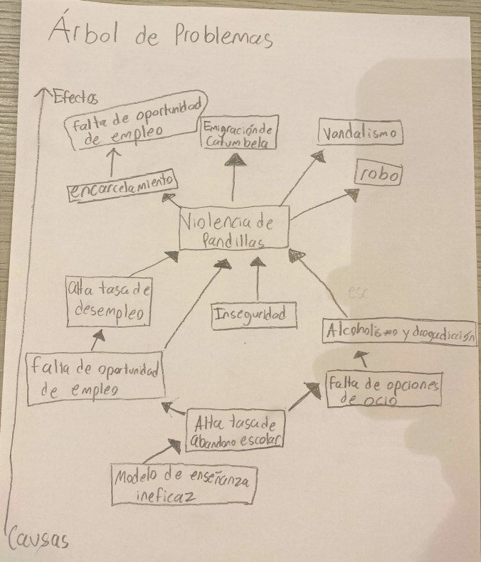 En este caso Jordan ha escogido “Violencia de pandillas” como el problema principal del Árbol de Problemas, enhorabuena por la innovación. Entonces vamos a analizar las consecuencias y las causas seleccionadas por Jordan de su problema principal.